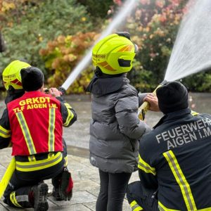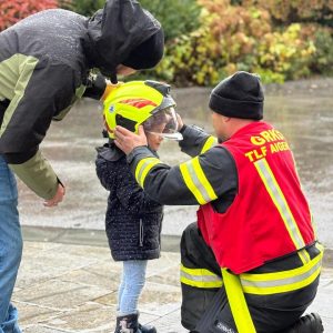 Die Kinder durften selbst zum Strahlrohr greifen und Helme sowie Atemschutz ausprobieren. Natürlich stand auch eine kleine Rundfahrt mit unseren Fahrzeugen auf dem Programm! Nur der Wintereinbruch hätte uns fast die Show gestohlen