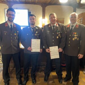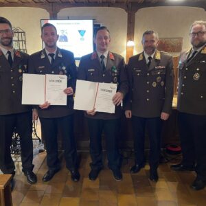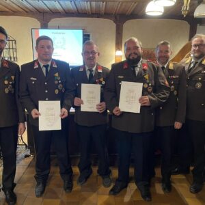 Nach den Ehrungen der Dienstjubiläen wurde unser Lotsenkommandant BI Gerald Seiringer für seine langjährige Bewertertätigkeit im Bezirk mit dem Feuerwehr-Ehrenzeichen des Bezirkes Rohrbach ausgezeichnet. Die Bezirksmedaillen in Silber erhielten HBM d.F. Andreas Schopper und BI Lukas Holnsteiner.