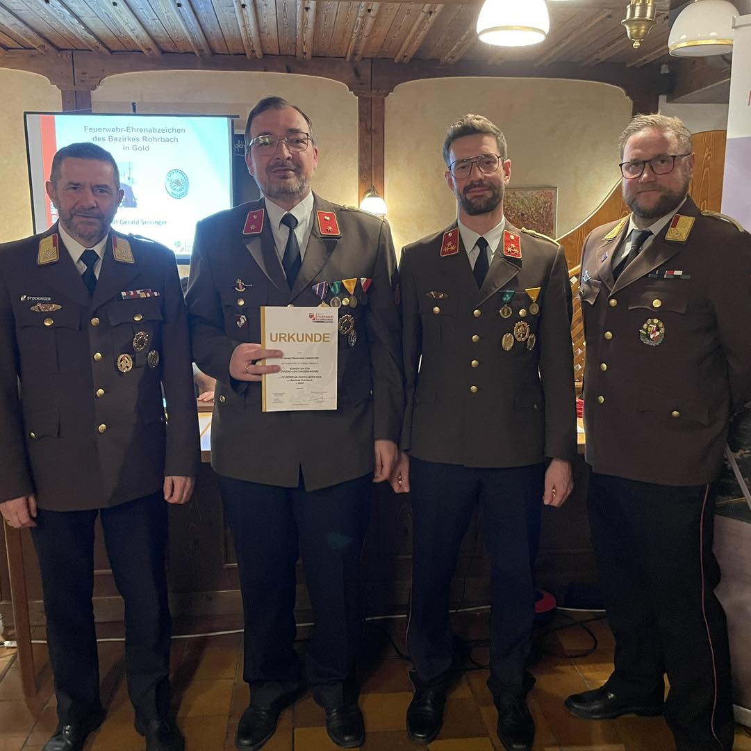 Nach den Ehrungen der Dienstjubiläen wurde unser Lotsenkommandant BI Gerald Seiringer für seine langjährige Bewertertätigkeit im Bezirk mit dem Feuerwehr-Ehrenzeichen des Bezirkes Rohrbach ausgezeichnet. Die Bezirksmedaillen in Silber erhielten HBM d.F. Andreas Schopper und BI Lukas Holnsteiner.